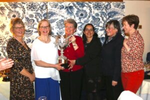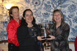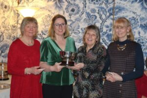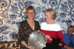 2024 Prize-giving. Previous year’s winner, Gillian Russell, presenting Christine Taylor with Gairney Rosebowl. Also in winning team, Fiona Rutherford and Angela Wilcox.