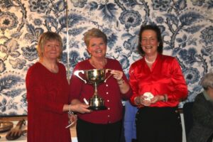 2024 Prize-giving. Previous year’s winner, Gillian Russell, presenting Christine Taylor with Gairney Rosebowl. Also in winning team, Fiona Rutherford and Angela Wilcox.